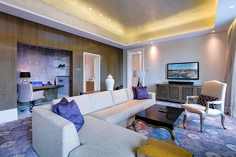This Two-Bedroom Deluxe Premium Suite features formal living and dining areas, a fully serviced open pantry with a breakfast bar and spacious private bathrooms.
